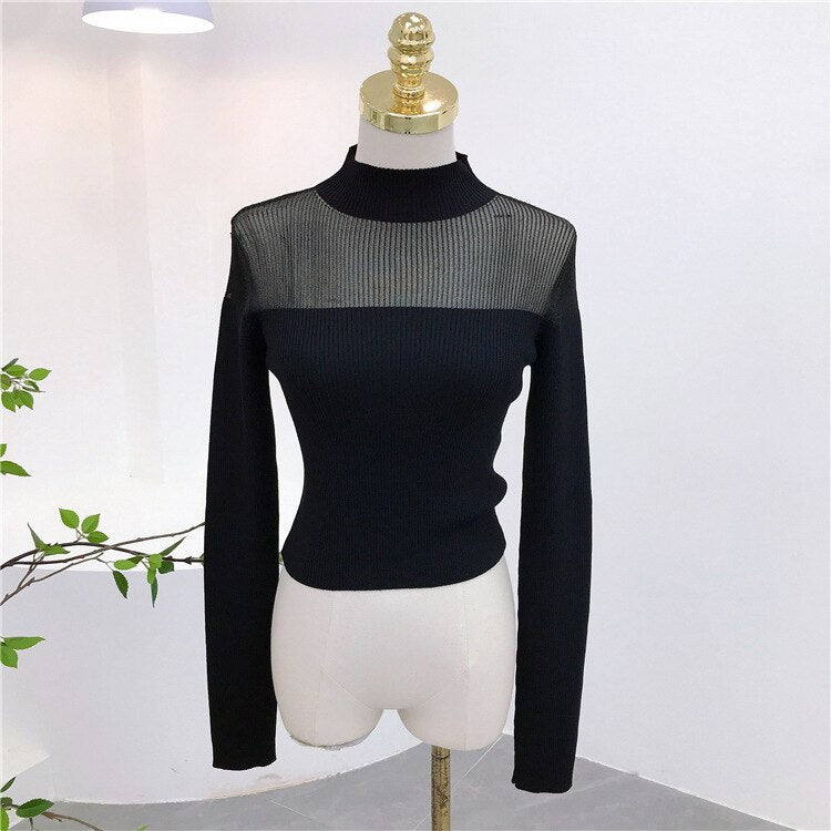 GetSpring Women T Shirt Full Sleeves Stand Collar Organza Perspective Black Tshirt Sexy Bottoming Short Black Tee Shirt Spring