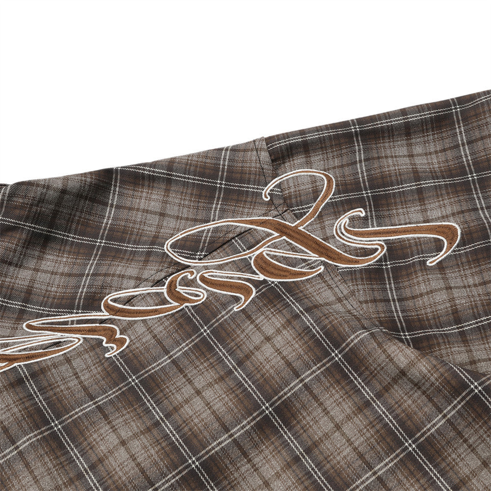Gothic Letter Embroidery Plaid Short Sleeve Shirt Men's Vintage Street Fashion Workwear Checkered Collar Loose Fit