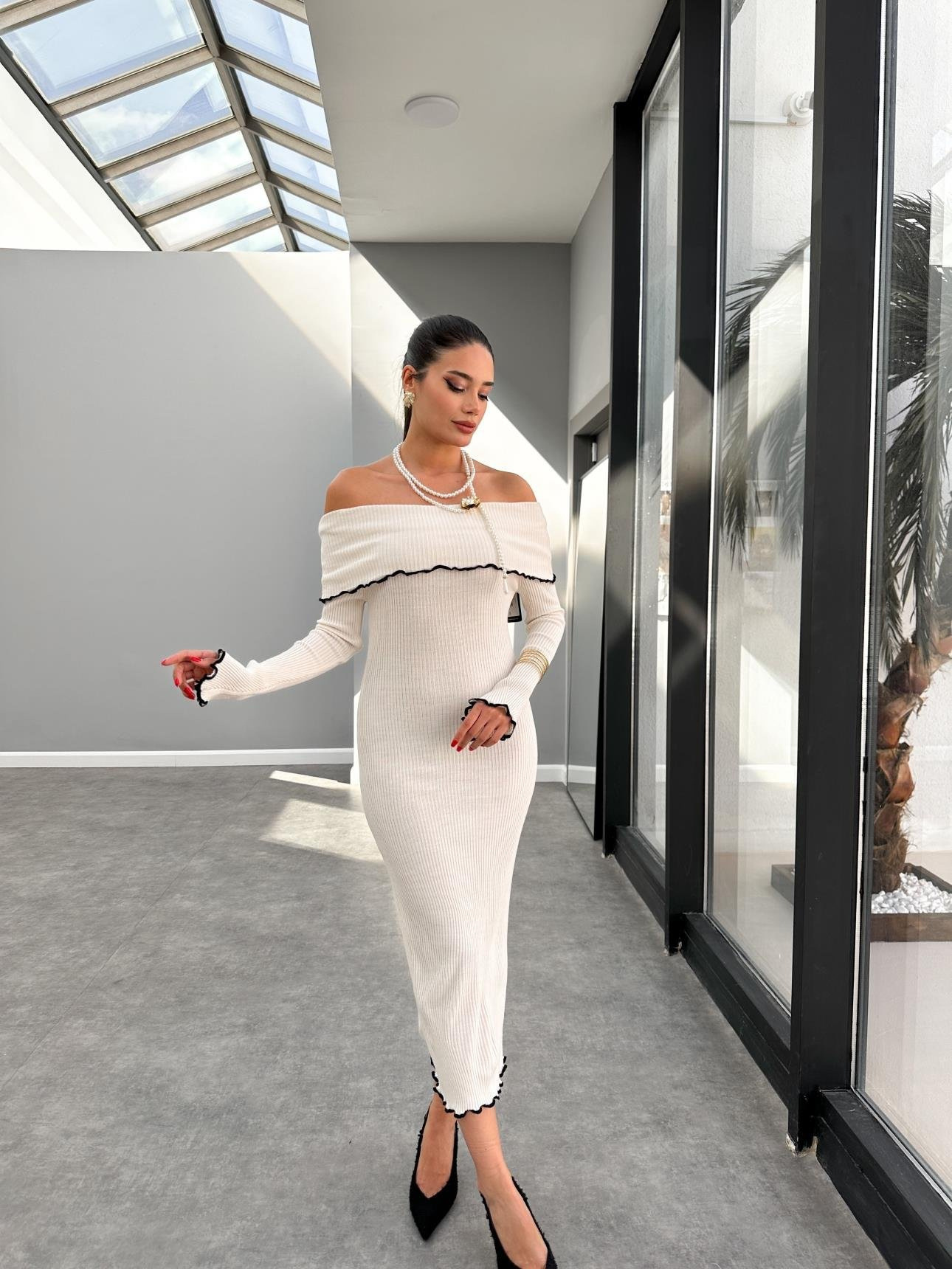 One line shawl long sleeved slim fit black fungus edge temperament dress