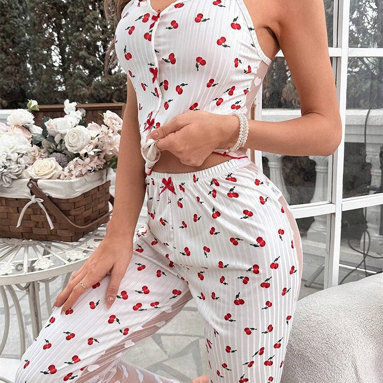 Sexy Ruffle Trimmed Multi-Color Heart Print Comfortable Casual Loungewear Set - Strap Shorts