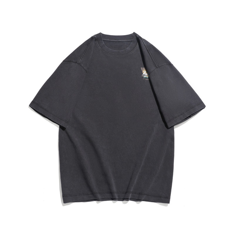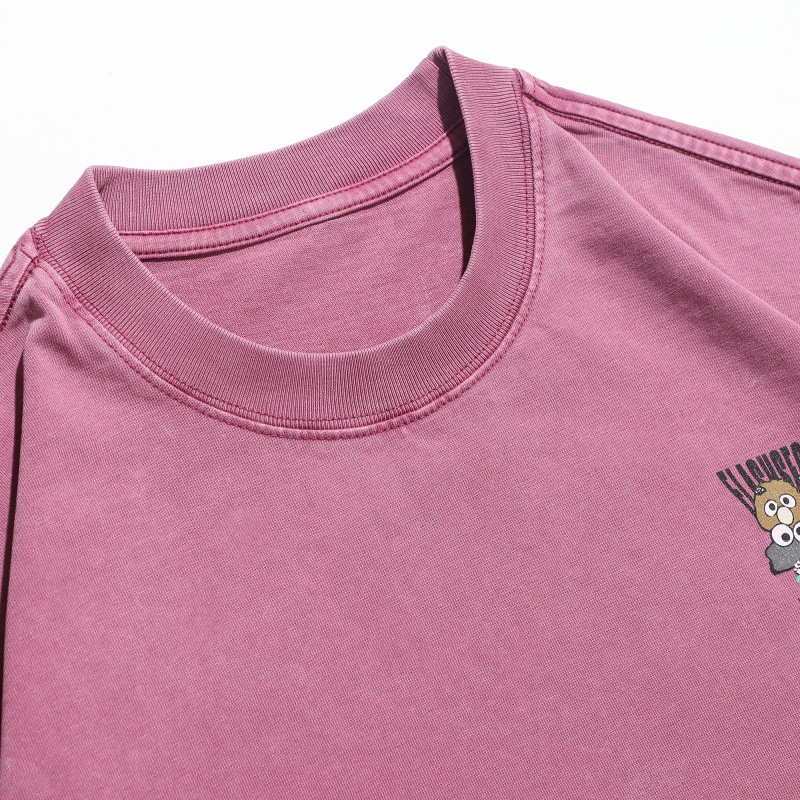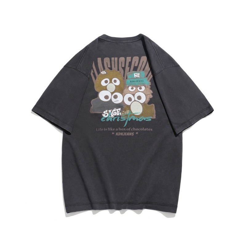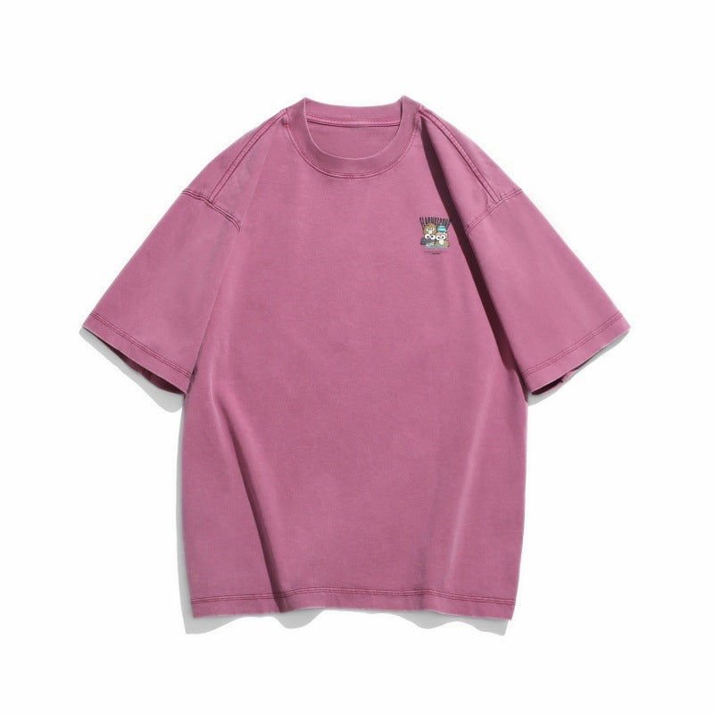 Water washed vintage fun printed loose round neck short sleeved shirt